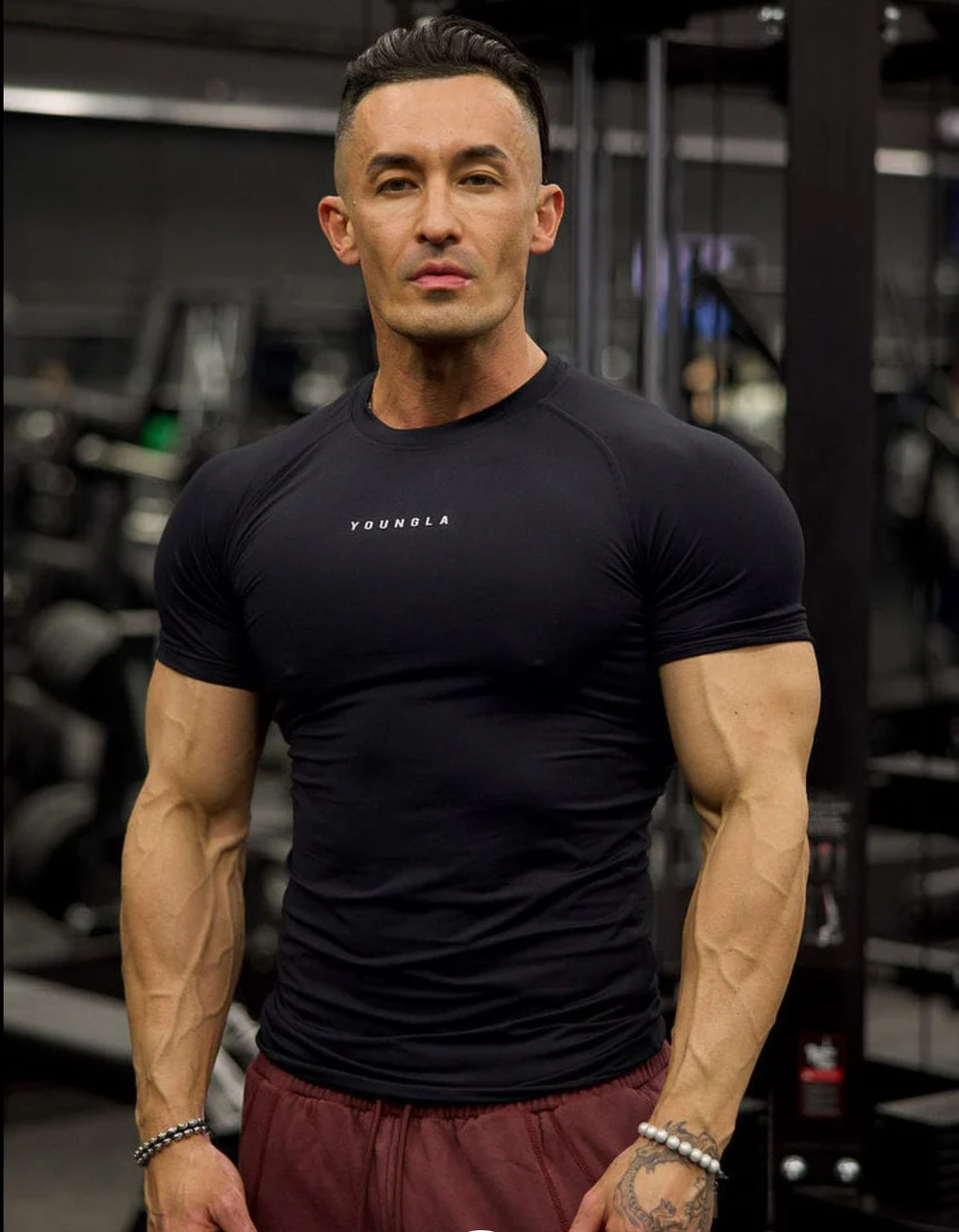 DISEÑO: Camiseta clásica de compresión diseñada como una parte superior de rendimiento con ajuste ceñido. Hecha para contornear la parte superior del cuerpo con una silueta atlética limpia. Incluye un cuello estructurado, confección lisa y un branding mínimo de YoungLA en el pecho.