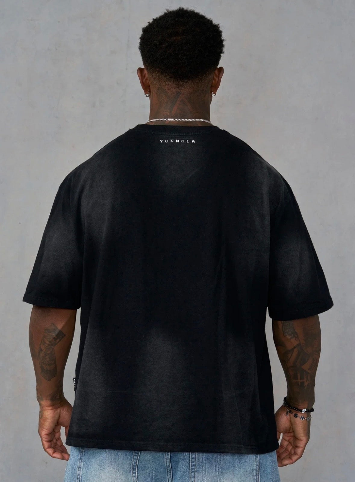 DISEÑO: Gráficos estilo sombra dominan el frente, con arte audaz y desgastado inspirado en personajes icónicos de Batman. Cada diseño se presenta sobre una camiseta negra lavada, lo que le da un look usado con tonos más oscuros y grunge. El fit es relajado y cómodo, ideal para el día a día con energía protagonista.
